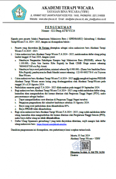 - Peserta yang dinyatakan Di Terima ditetapkan sebagai calon mahasiswa baru Akademi Terapi Wicara T.A 2024 - 2025.